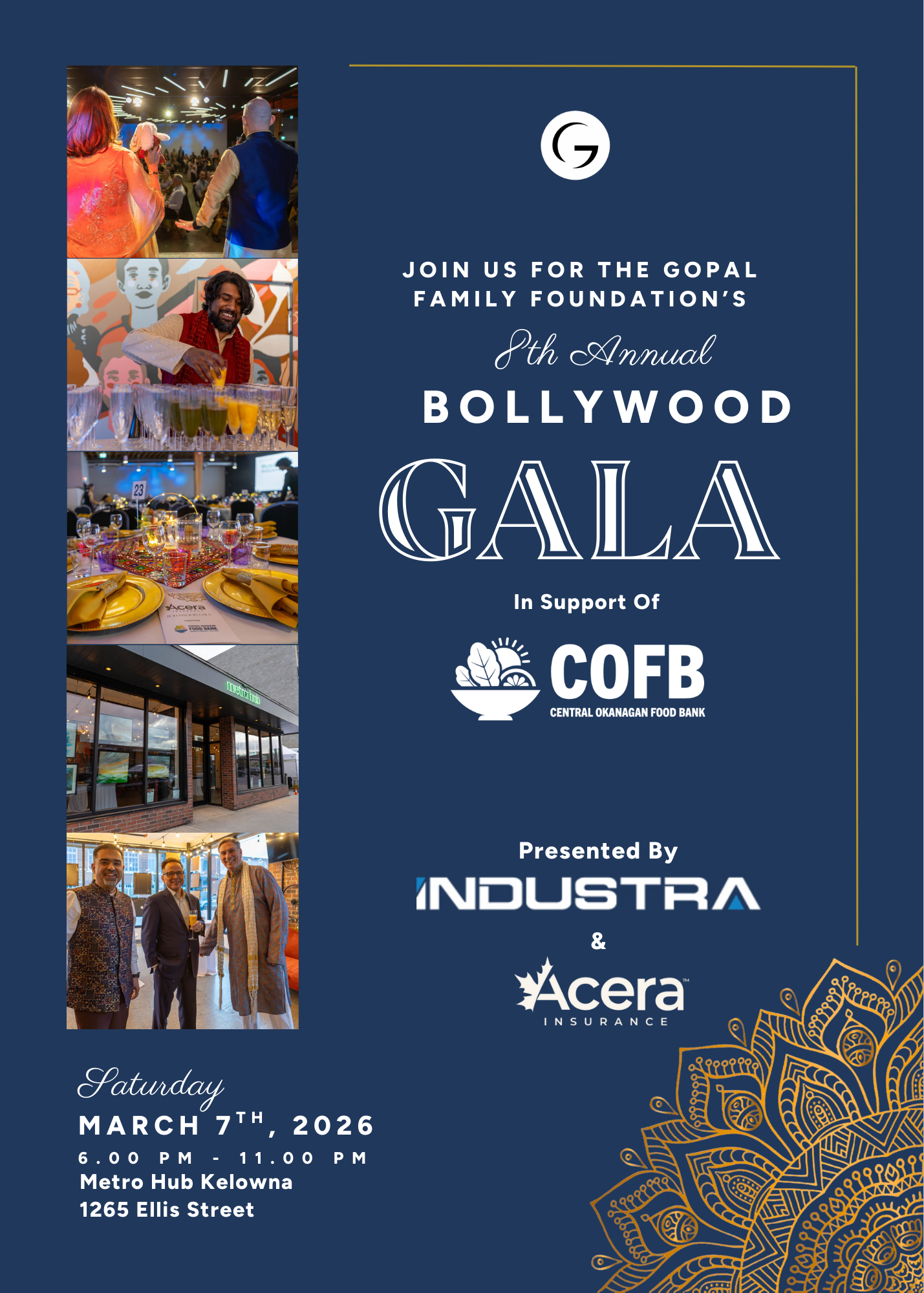 The Gopal Family Foundation presents the 8th Annual Bollywood Gala, generously sponsored by Acera Insurance, in support of the Central Okanagan Food Bank!